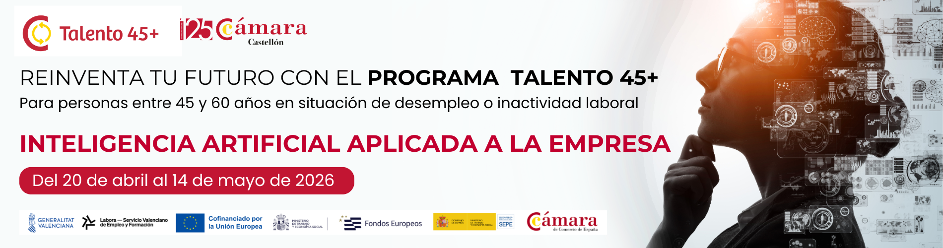 El programa 45 + és una iniciativa de les Cambres en el marc del Programa Operatiu d'Ocupació Formació i Educació 2014-2020 (POEF) cofinançat pel Fons Social Europeu i la Diputació de Castelló, dirigida a pal·liar els efectes immediats que la crisi del coronavirus ha provocat sobre el col·lectiu de persones entre 45 i 60 anys en situació de desocupació.